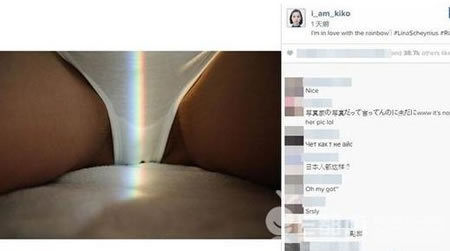 水原希子搭配图片写的文字是:“I'm in love with the rainbow(我爱上彩虹了)。”标签则是“Lina Scheynius”,表示这是Lina Scheynius的照片。虽然如此,但是很多粉丝都误以为这是水原希子的下体自拍照,让众多粉丝们都震惊不已。尤其照片中女性的下体部位完全没有遮掩,于是愤怒的粉丝们纷纷留言大骂恶心。
