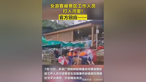 事发后,阳朔县委、县政府高度重视,迅速成立工作小组进行调查处置。经调查,事件起因系游客嬉水影响竹筏靠岸引起口角,进而引发肢体冲突。冲突发生后,已于第一时间将1名游客送至医院检查,经初步诊断身体无大碍。目前,涉事3名筏工因殴打他人已被公安机关处以行政拘留十五日并处罚款;对涉事的遇龙河公司主要领导和分管领导进行停职处理;按相关制度规定对码头管理人员进行处理。我局已向相关游客通报调查处理情况并真诚致歉。
