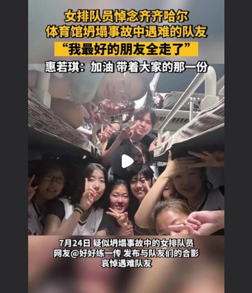 根据消息来源,黑龙江齐齐哈尔第34中学体育馆坍塌事故发生在近日。这场事故导致多名人员不幸遇难,其中包括女排队员们的同伴。被粉丝熟知的一位名为“好好练一传”的女排小球员转发了一条消息,并在自己的账户上发表了对遇难队友的深切悼念之情:“我最好的朋友全走了!”