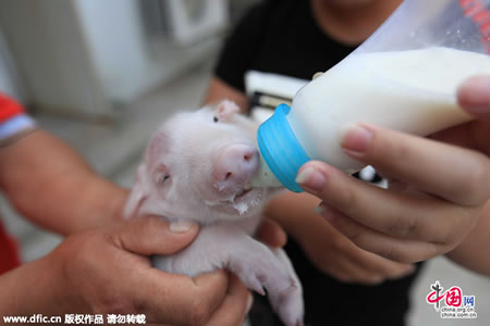 据收养人介绍,从来没见过这样的猪。现场记者看到,由于头部太重,它站立不起来,好心人专门给它买了婴儿奶粉用奶瓶喂养,小猪宝宝的两张嘴都能进食。杨金亮希望得到动物专家的专业帮助指导,希望这头双头猪健康成长。