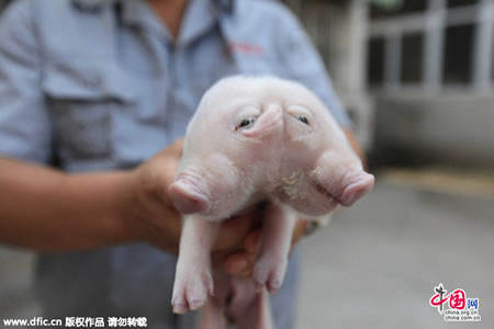 2015年8月28日,天津市西青区发生一件奇闻,一只小猪宝宝竟有两个脑袋三只耳朵。记者驱车来到辛口镇第六埠村,杨金亮告诉记者,这几天这头猪崽已成为明星,很多人慕名前来观看。指月/东方IC