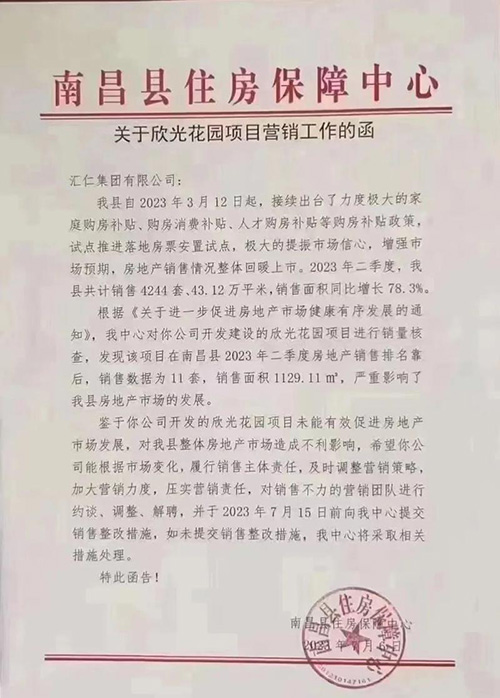 近日,一张“南昌县住房保障中心关于欣光花园项目营销工作的函”引发关注。其中称,南昌县欣光花园项目2023年二季度销售排名靠后,销售数据为11套,销售面积1129.11平方米,严重影响了该县房地产市场的发展,并表示,希望该项目及时调整营销策略,对销售不力的营销团队进行约谈、调整、解聘,并提交销售整改措施。
