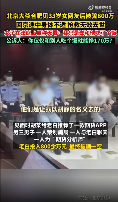 8月24日据报道,6旬大爷老白驾车从合肥回京途中身体不适被送医,抢救无效过世。老白曾告诉女儿,如果自己不在了打开电脑会知晓其遭遇。原来老白在网上认识了33岁女子“胡静”,双方很快陷入恋爱。2022年老白赴合肥与其见面,掉进了4名骗子设下的圈套。女子胡某以胡静的身份负责与老白见面吃饭,见面时胡某给老白推荐了一款期货APP,另三男子一人策划骗局,一人与老白聊天,一人为“期货分析师”。老白先后投入了800余万元。老白女儿得知后报警,警方介入调查。