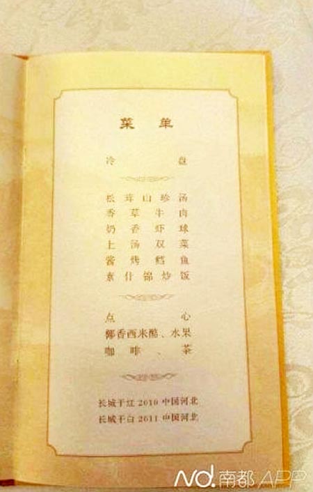 菜单包括:冷盘、松茸山珍汤、香草牛肉、奶香虾球、上汤双菜、酱烤鳕鱼、素什锦炒饭。此外,中国还为出席上午纪念活动的贵宾提供了点心、椰香西米露、水果、咖啡、茶。酒品包括长城干红2010、长城干白2011。