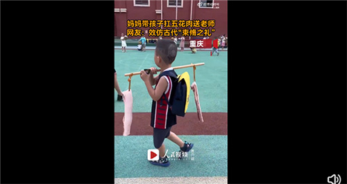 教师节临近,重庆一萌娃扛着两条五花肉送给老师当礼物。