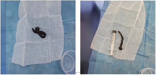 蚂蟥身上长有吸盘,可以很紧密地吸附在气管壁上,如果直接用钳子生拉硬扯,会损伤患者的气道引起气管粘膜损伤等并发症,若不慎把蚂蟥扯断吸盘还残留在体内徒增二次手术。在医务人员默契协作下,通过全麻无痛支气管镜完全将蚂蟥取了出来,经测量这条蚂蟥体长约8cm。蚂蟥取出后,韦某咳嗽、咳痰、痰中带血及喉间异物感消失,很快就恢复正常,精神状态良好,目前已恢复健康并出院。