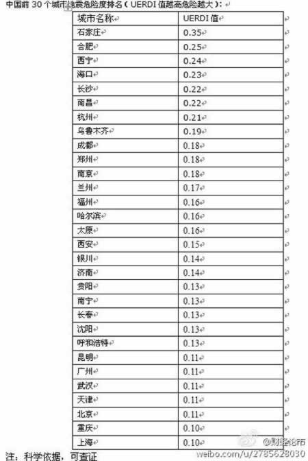 中国城市地震危险度排名出炉:UERDI值越高危险越大