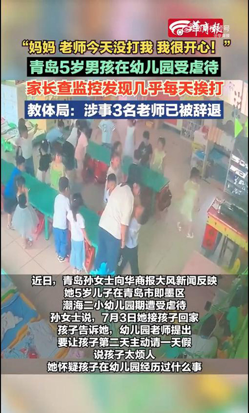 @华商报 消息,近日,青岛的孙女士反馈,她5岁儿子在青岛市即墨区潮海二小幼儿园上学期间的被虐遭遇。