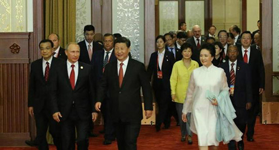 阅兵式结束后,纪念中国人民抗日战争暨世界反法西斯战争胜利70周年招待会在人民大会堂举行。这时习近平和彭丽媛同参加招待会的外国领导人共同步入宴会厅,彭丽媛白色长裙搭配淡蓝色鞋包,清丽而飘逸。