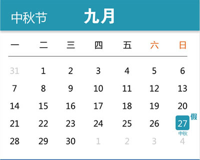 中国网9月6日讯 根据国务院办公厅发布的节假日安排显示,今年中秋节正逢新历9月27日(周日),因此中秋节放假时间为:9月26日(星期六)、9月27日中秋节(星期天,法定节假日),共两天。而今年国庆节10月1日至7日放假调休,共7天。10月10日(星期六)上班。