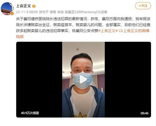 11月9日早,举报襄阳健桥医院院长违法犯罪事件当事人 @上官正义再发博:关于襄阳健桥医院院长违法犯罪的最新情况,昨夜,襄阳方面向我通报:我举报该院长涉嫌贩卖出生证,贩卖疫苗本,贩卖婴儿的问题,全部属实,目前他们已经查获多起贩卖婴儿的违法犯罪事实,给襄阳公安点赞。