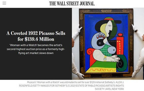 近日,毕加索的画作《戴手表的女人》在美国纽约的拍卖中以约1.39亿美元、约合人民币10亿元 成交,成为毕加索画作中拍卖价格第二高的作品,负责此次拍卖的苏富比拍卖行说,这是今年全球拍卖会上成交价最高的艺术品。