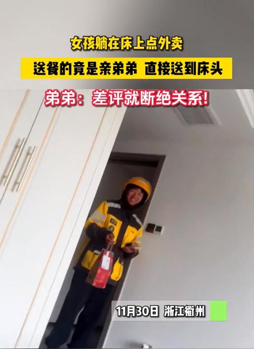 12月1日消息,据国内多家媒体报道,一名女子在家点外卖碰到亲弟弟配送,直接进门送达“床头”,姐姐拍完视频后反手给了一个好评。