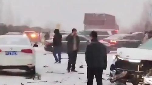 网传视频显示,高速路上正在下雪,路面较滑。多辆机动车发生碰撞,有车辆侧翻,受损严重,还有车辆安全气囊上有血迹,多人站在路面拨打电话。