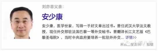 哇靠,看见没有,【医学世家,写得一手好文章出过书。武汉大学法文教授,现任外交部驻法国巴黎一等外交秘书。曾翻译长江文艺版《巴黎圣母院》,当时中央政府要培养一批驻外外交官,他因精通法文、英俊潇洒、才华横溢,经湖北省政府推荐,由中央政府派到国外进修。后任职中国驻法国领事馆,在外交界属于政治人物。是著名演员刘亦菲的父亲。】流弊死了哇!