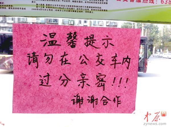 昨日上午9点多,郑州网友@楠楠记事本发出了一条微博,称在35路公车上有对情侣动作过分亲密,乘客多次提醒,车长还用语音报站器含蓄地提醒,但这对情侣依然我行我素。车长无奈下,第二天在公交车上贴出温馨提示,希望乘客能够注意自己的言行,文明出行。