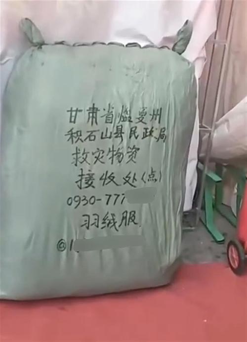 视频显示,在某一展销会上,出现了一个编织袋包裹,上面写有“甘肃省临夏州积石山县民政局救灾物资接收处(点)”和“羽绒服”等字样,还有疑似捐赠者和接受方的电话。上述视频引来诸多争议,有网友怀疑有人在倒卖捐赠震区的物资。
