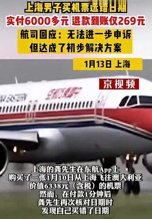 6338元机票看错日期只退还269元 东航回应