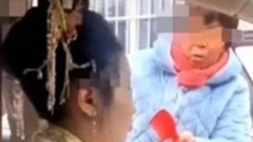 视频里称,有女子一身新娘打扮坐在车里。车外,一位大妈表示:“开车的司机,必须亲新娘一口……必须要亲,俺这有这规矩。”说完这话后,车外的人还集体起哄:“亲!必须亲!”