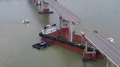 发布会上,相关负责人表示:今天凌晨5时31分左右,佛山籍集装箱船“良辉688”轮在航经南沙洪奇沥水道时,因船员操作失当,“良辉688”轮左舷船身触碰沥心沙大桥下行通航孔18#桥墩,随后船头再次触碰下行通航孔19#桥墩,致使该通航孔上的桥面断裂。经核实,共有4辆车和1辆电动摩托车从断裂处坠落,其中1辆空载中巴车、1辆货车和1辆电动摩托车坠落到“良辉688”船舱内,2辆小货车掉落水中。在该事故中,造成5人死亡(空载中巴车驾驶员1人、电动摩托车驾驶员1人、落水小货车3人),2人在医院救治,目前生命体征稳定;肇事船舶一名船员轻微伤。