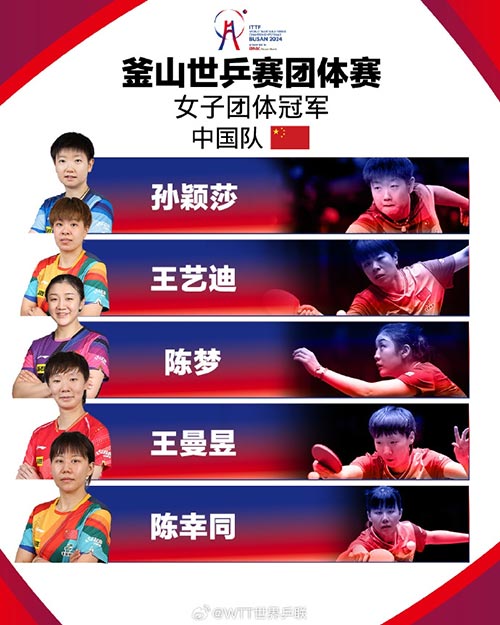 北京时间2月24日,世界乒乓球团体锦标赛女团决赛,由孙颖莎、陈梦、王艺迪组成的中国队打满五场,总比分3-2力克日本实现六连冠,队史第23次捧起考比伦杯!