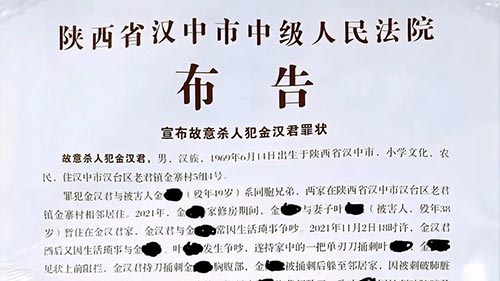3月18日,汉中市中级法院张贴布告,宣布对故意杀人犯金汉君押赴刑场,执行死刑。之后,该布告在网上被转发。3月22日,澎湃新闻从汉中中院确认了该布告的真实性。