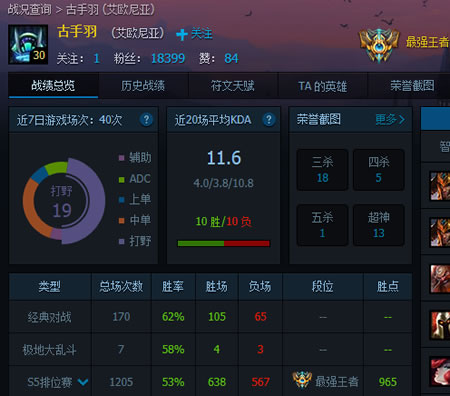 古手羽是国服高端路人打野玩家,曾经上过国服第一,目前在国服排名是第16名。他非常擅长酒桶寡妇等版本强势的打野英雄。下面小编就为大家介绍一下古手羽的个人资料微博。