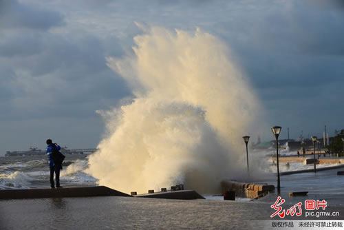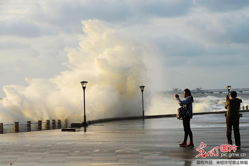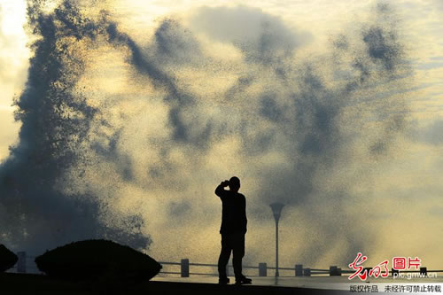 2015年9月29日,山东省日照市灯塔广场景区,游客在用手机拍摄台风"杜鹃"掀起的巨浪。