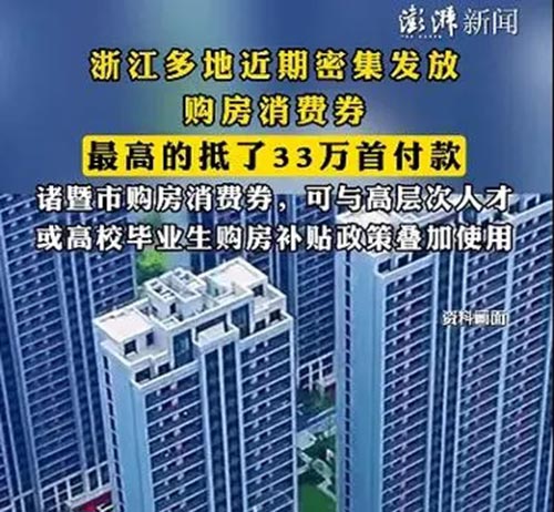原标题:浙江多地近期密集发放购房消费券,最高的抵了33万首付款