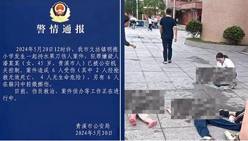 2024年5月20日12时许,我市文坊镇明德小学发生一起持水果刀伤人案件,犯罪嫌疑人潘某某(女,45 岁,贵溪市人)已被公安机关控制。案件造成6人受伤(其中2人经抢救无效死亡,4人无生命危险),另有6人在躲闪中轻微擦伤。