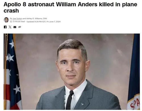 央视新闻消息,当地时间6月7日,曾经执行“阿波罗8号”任务的美国宇航员威廉·安德斯(William Anders)当日在华盛顿州圣胡安群岛遭遇坠机事故。安德斯在事故中死亡。