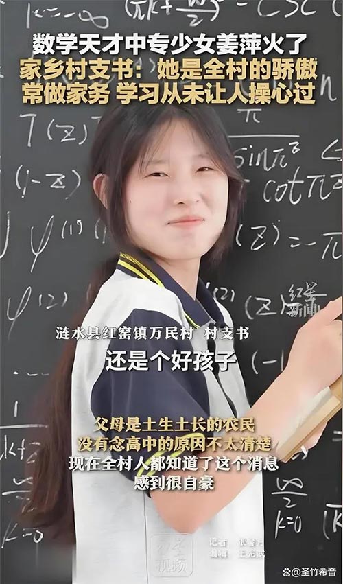 近日,江苏省涟水中等专业学校的17岁女生姜萍,在全球数学竞赛中“爆冷”以排名第12的成绩入围决赛,成为赛事历史上首位进入决赛的中专生。