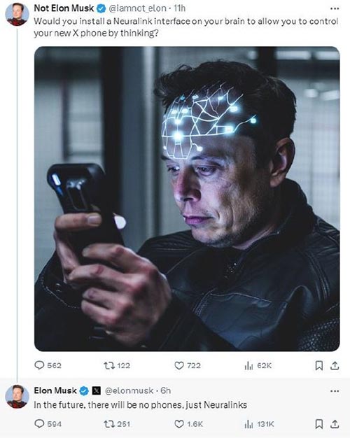6月17日,有网友在社交平台X上发文提问,“你会在你的大脑上安装一个Neuralink接口,让你通过思考来控制你的新X手机吗?”对于这个问题,特斯拉和Neuralink首席执行官埃隆·马斯克在评论区表示:未来将不再有手机,只有Neuralink。此前6月10号一位X平台用户发文预测马斯克将打造一款X Phone,马斯克对此回复称“这并非不可能”。