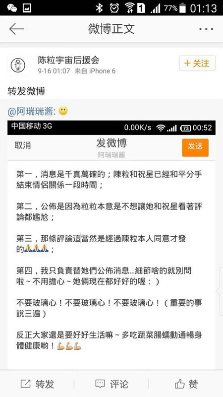 有网友表示祝星去了英国之后,从陈粒一路过来的微博看,祝星,在她最穷困潦倒什么都没有的时候,还愿意和她一起,陪她疯带她回自己的家,陪着她一站一站的巡演,给她设计专辑封面,给她当ppt小妹,在陈粒生病的时候给她做饭还逗她开心,生日的时候也用心的做礼物,除了陈粒从来不在微博上任何一个人暧昧,微博不开评论也不和粉丝勾搭,陈粒和那些奇怪圈子里的人我不清楚,只知道比起她我更欣赏祝星,估计这就是分手原因吗?