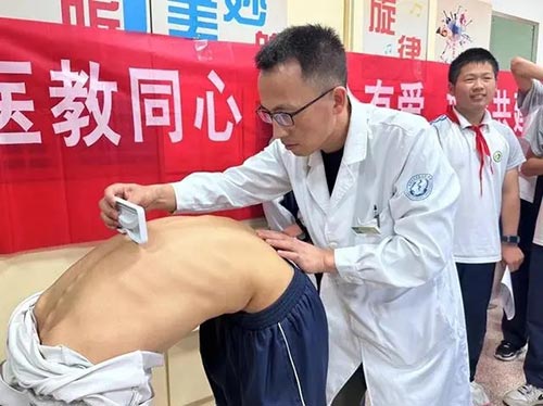 市中医院推拿科的医生用通俗易懂的语言,带领学生正确认识青少年特发性脊柱侧弯。现场为体检异常学生做了进一步筛查和分类,其中ATR(躯干旋转角度)大于等于5度以上的39人将入组接受各种干预。