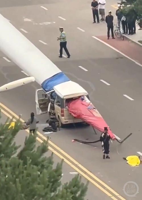 近日,有网传视频显示,一辆面包车与运输中的风力发电机叶片疑似发生追尾。叶片尖端插入后方面包车的车头内,贯穿车辆,面包车内有人员受伤。