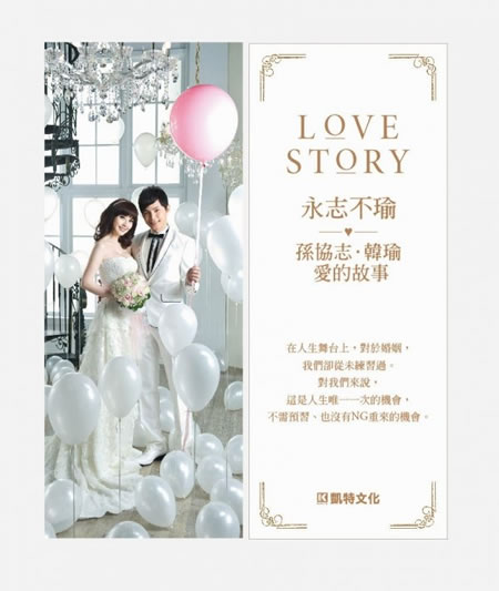 据悉,当年孙协志和韩瑜婚宴的伴手礼《永志不瑜 ‧ 爱的故事》一书大抢手。书中收集了两人相识500多天来的生活照与工作档案,更包括简讯和甜蜜的纸条,让收到的朋友都能感受到浓浓的甜蜜。《永志不瑜 ‧ 爱的故事》更邀请两人的妈妈撰文,给这对新人祝福,两位妈妈字里行间充满对子女的疼爱,孙协志的妈妈更称韩瑜「乖巧瑜媳」并说她能性情柔顺,能修补孙协志的冲动脾气,对儿媳盛赞有加。