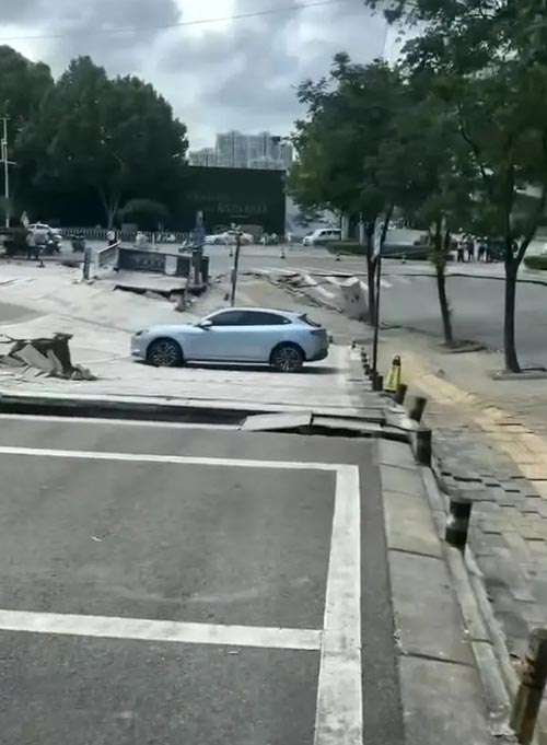 网传视频显示,地面一交叉路口处呈椭圆形塌陷,路口附近的停车场的闸口栏杆已经倾斜,在塌陷区域有一辆汽车停留,数名身穿制服的人员在现场。现场目击者黄先生(化名)在接受读特新闻记者采访时称,事情发生在下午2点左右。“没有人受伤,很多部门都来了,现场已经被围起来了。”对于塌陷的原因,黄先生猜测或与修地铁有关。