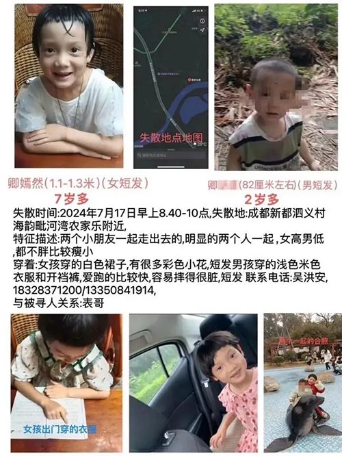 寻人启事内容显示,失踪姐姐名叫卿嫣然,今年7岁,弟弟今年3岁,于2024年7月17日早上10点左右,在四川省成都市新都区泗义村3组海韵毗河湾附近走失。