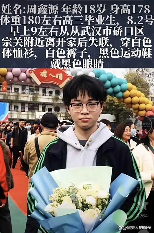 武汉失联多日的18岁高中毕业生周鑫源已确认死亡!