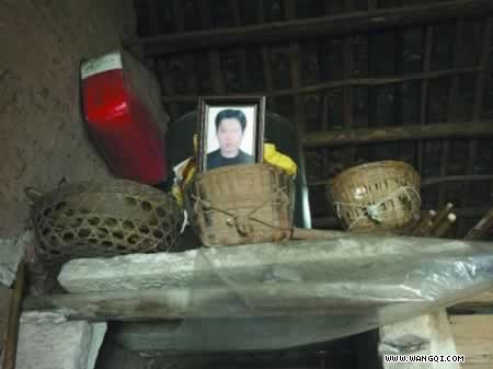 图片说明:周德军的遗像现在放在土屋里石仓上的一个箩筐里