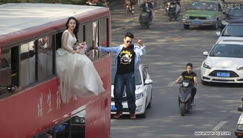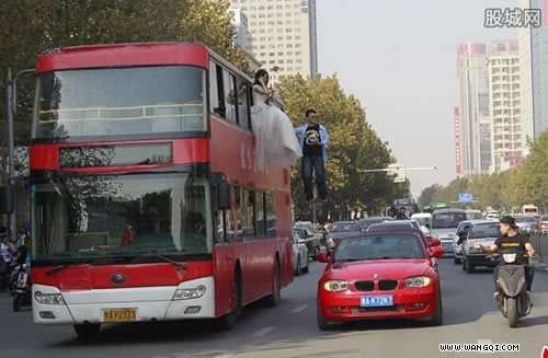 2015年10月15日,郑州市花园路,一辆行驶中的公交车外侧,一男子身穿礼服,单手支撑悬浮在公交车一侧,一女子身着婚纱端坐公交车前侧,而缓缓前行的公交车周围,被百万豪车开路护航,进行着一场公交“悬浮婚礼”。