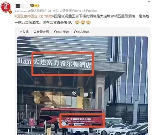 多名网友在社交平台表示,国足在大连下榻的是大连富力希尔顿酒店,“每晚价格2500元以上”。多张照片显示,印有“中国国家男子足球队”的大巴确实就停在大连富力希尔顿酒店门口。《足球报》也证实,国足的确选择了该酒店。可能是酒店方面担心球迷追星,还在酒店大堂内放置了金属围栏。消息传出后,也引发不少关注和吐槽,有网友表示,“惨败日本队7个球,还好意思住这么豪华的酒店,建议就住七天酒店吧”“一晚上房费顶半个月工资了”……