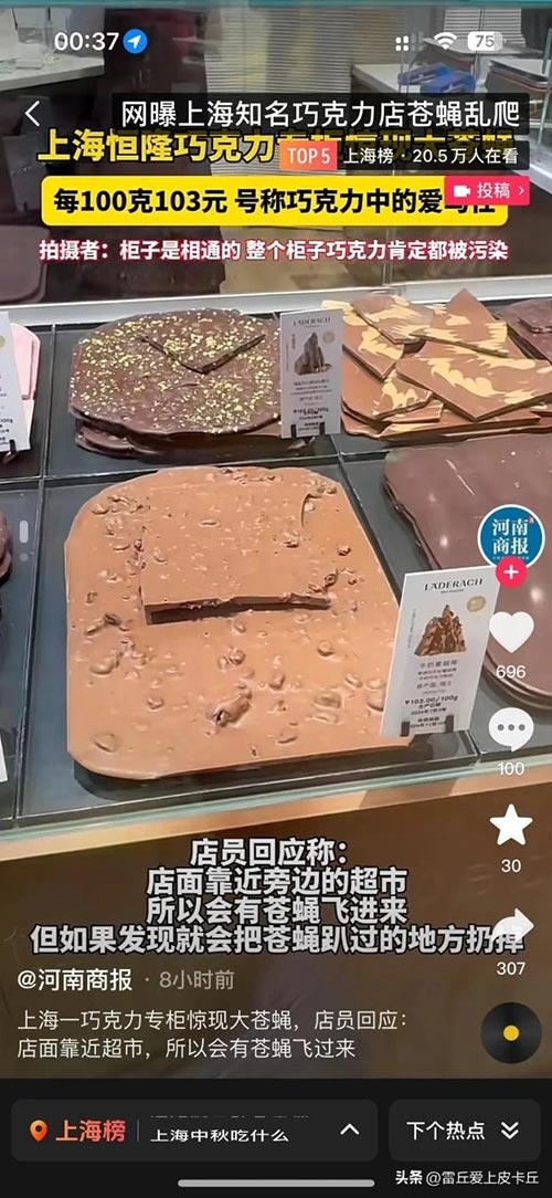 9月9日,上海一女子称,在Laderach莱德拉上海港汇恒隆店发现专柜里有一个苍蝇在巧克力上面爬,柜子是相通的,感觉很恶心。