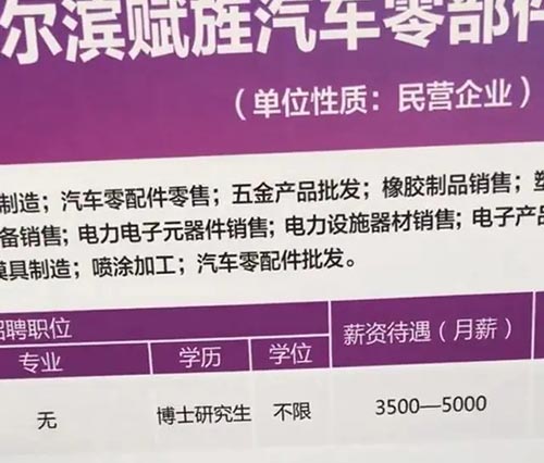 视频中,一广告牌上写着“2024年度哈尔滨‘丁香人才周’(秋季)引才现场招聘活动”,一家名为哈尔滨赋旌汽车零部件有限公司的招聘信息为:招聘20名“普工”,没有专业限制,学历要求为“博士研究生”,年龄要求“18岁-50岁”,薪资待遇(月薪)为“3500元-5000元” 。视频拍摄者感叹道,“是不是有点扯?”“博士和卖茶蛋的差不多”。