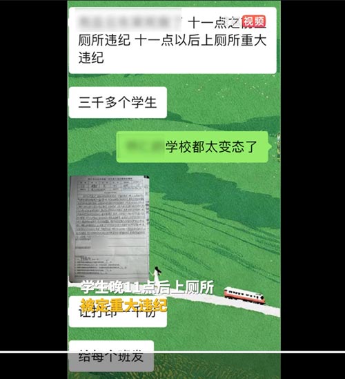 上述工作人员表示,该校每晚10点20分下晚自习,10点45分熄灯。按规定,熄灯后至11点40分间,除特殊情况外,学生不许上厕所、随意走动,“担心影响别的学生入睡。”如因身体不适等原因必须在该时段上厕所,需提前告知管理老师,否则将被记严重警告处分一次。