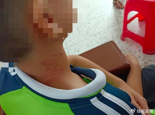 9月23日,有网友发视频称,广东廉江和寮镇朱埇小学校长因学生忘戴红领巾撸学生脖子,班主任上前拉开,校长还追上来打。多张图片显示,学生脖颈处有明显的红色伤痕,局部还有破皮。学生家长称:“廉江市和寮镇朱埇小学校长因儿子升国旗忘记戴红领巾,就把儿子脖子撸成这样,差点断命,这种教育行为怎能忍得了?”