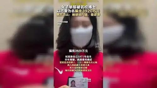 2024年11月,北京女子权某在网上发布多段视频,实名举报在北京大学获得博士学位的男子梁某,隐瞒婚姻事实,以恋爱的名义骗取她3920万元,她有文字、录音等证据,警方已立案。