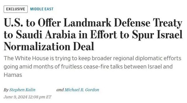 在今年6月的一则报道中,美国《华尔街日报》表示,美国拜登政府向沙特提出了一份“历史性的”防务协议,美国承诺协防沙特,以换取沙特和以色列的关系正常化。包括《华尔街日报》等媒体曾宣称,这项防务协议的内容“几近完成”。