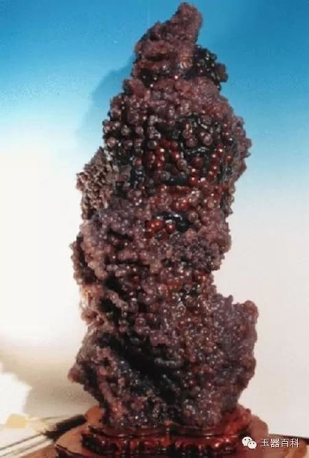 《钟馗》6500万元的中国第一葡萄玛瑙石“钟馗”葡萄玛瑙“钟馗”是一块在石界具有很高知名度的奇石。“钟馗”慨然仰天,英姿勃发,其头顶官帽,身披战袍,一身疙疙瘩瘩恰似刀枪不入的铮铮铠甲,平添几分杀气。若光线强烈,七色幻彩可透体而出,壮哉!神哉!“钟馗”巍然而立,高116厘米,宽48厘米,厚52厘米,约200公斤重,如此巨大而又威猛的造型石,为葡萄玛瑙之罕见。难怪有人管它叫做“大漠霸王石”。